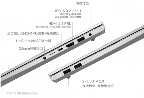外联接口也非常丰富,包括全功能USB4(支持PD充电和DP视频输出)、USB-A 3.2 Gen1(5Gbps传输速率)、两个USB-A 2.0(外接键鼠外设)、HDMI 2.1 FRL(支持 4K电视/显示器等)、MicroSD 读卡器和3.5mm 音频插孔,满足各类扩展需求。