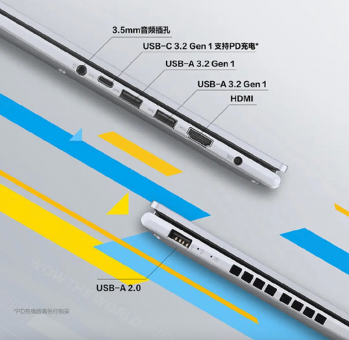 接口方面,笔记本右侧搭载了支持65W PD充电的USB-C 3.2 Gen1接口、3.5毫米音频插孔、两个USB-A 3.2 Gen1接口和一个HDMI输出接口;而左侧设计了一个USB-A 2.0接口,用于连接无线键鼠等设备。