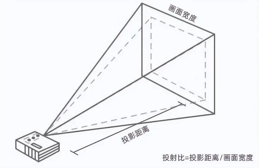 无论超短焦投影还是激光电视,在营销上基本都绕不开一句话,叫做“贴墙就能投百吋屏”。能够短距离投超大屏的关键,就在于投射比,投射比越小,同样的距离可以投出更大的屏幕。当投影仪的投射比小于0.4时,我们将其称之为超短焦投影。