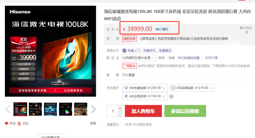 最后是重头戏,价格方面,由于激光电视针对的都是高端市场,因此价格一般都偏高,海信100 L 8K起售价高达39999元,即使是低配的80英寸款,售价也要到15999元。