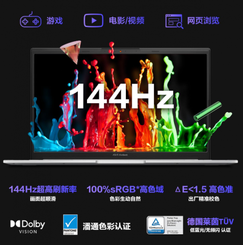 在屏幕上,华硕无畏Pro15搭载了一块144Hz电竞级高刷屏。刷新率指屏幕每秒能够刷新画面的次数,越高意味着画面流畅度越高,相比当下轻薄本普遍的60Hz/90Hz刷新率,无畏Pro15的144Hz高刷屏提供了更流畅的画面、更低的延迟,画面响应速度快,特别适合玩高清游戏或观看动态图像。除了高刷新率,这块屏幕还经过出厂精准校色,实现△E<1.5高色准,覆盖100% sRGB高色域,通过潘通色彩认证,支持全亮度DC调光,带来全面出彩的视觉盛宴,光鲜视界跃然眼前。并且它还支持180度自由开合,以实现不同场景下的多视角使用需求。
