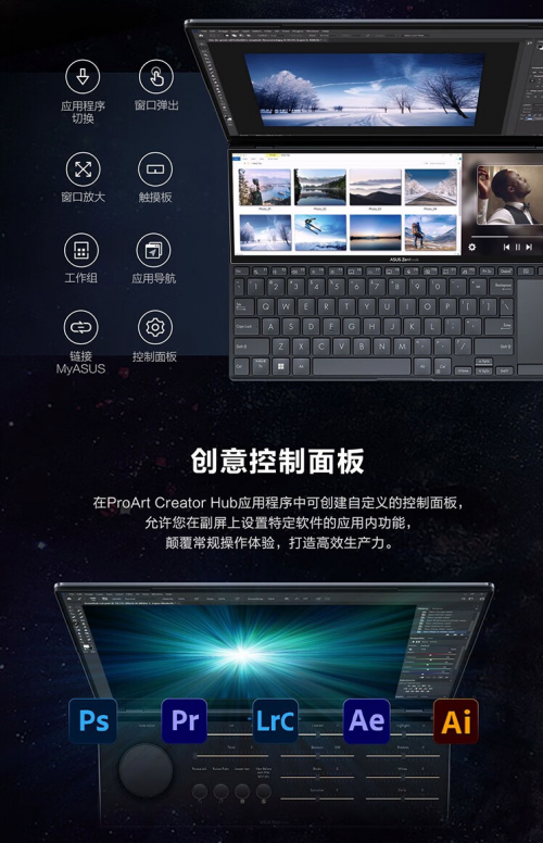 副屏有着专属的ScreenXpert 3软件,不仅让跨屏操作更加流畅,还能够通过左侧设置栏实现多种快捷操作,如应用切换、窗口弹出放大、应用导航、链接MyASUS、控制面板等等。最大的亮点是它可以作为adobe全家桶的创意控制面板,创建自定义的虚拟滑块、按钮和旋钮,比如在主屏显示控台,在副屏幕显示视频、音轨,让创作者拥有拥有更大、更高效的操作空间。