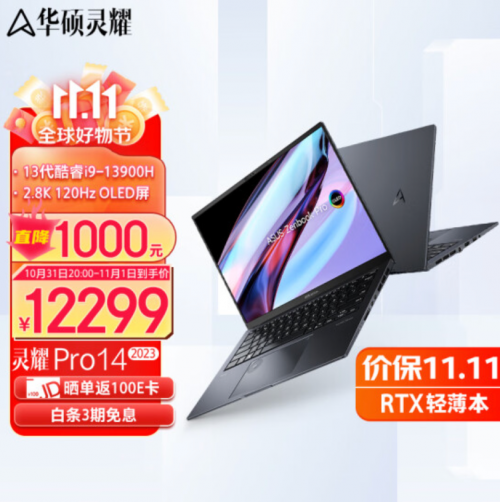 对于追求轻薄+高阶性能的朋友们,工作、生活、娱乐全方位满足的华硕灵耀Pro14 2023非常适合入手。双十一大促期间,这款高性能RTX全能本直降1000元,到手12299元,可享3期免息、晒单返100元E卡。