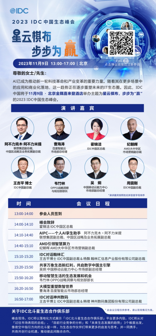 在此背景下,IDC中国将于11月9日在北京举办主题为“星云棋布,步步为‘赢’”的2023 IDC中国生态峰会。