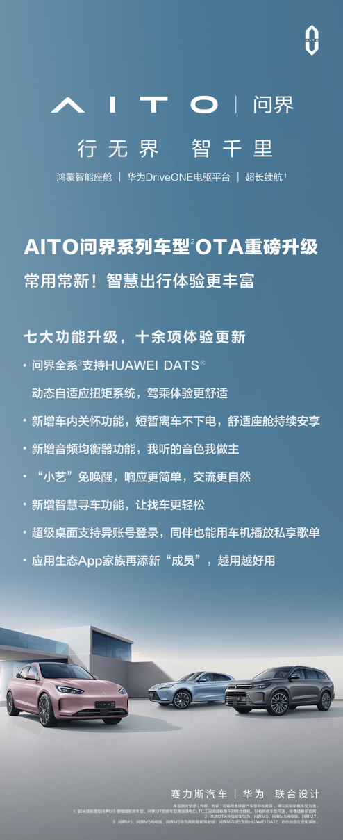 在新能源汽车领域,产品OTA升级堪比新车上市令人期待。7月16日,AITO问界系列车型正式开启全新OTA升级,包括三款车型:首款智能豪华电驱SUV问界M5、智慧豪华纯电SUV问界M5纯电版,以